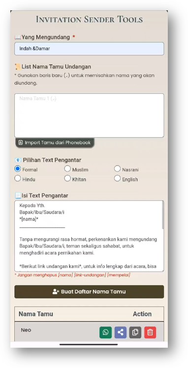 Invitation Sender Tools digunakan untuk memudahkan penyelenggara acara dalam menyebarkan link undangan kepada tamu undangan.